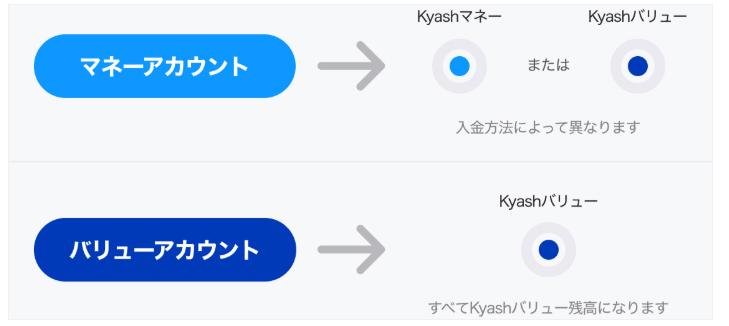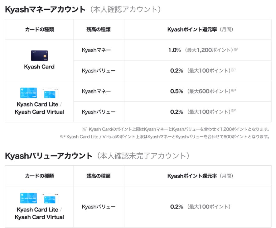 まず、ポイントは2種類(Kyashマネー、Kyashバリュー)あり、入金方法や本人確認の有無によって変わります。