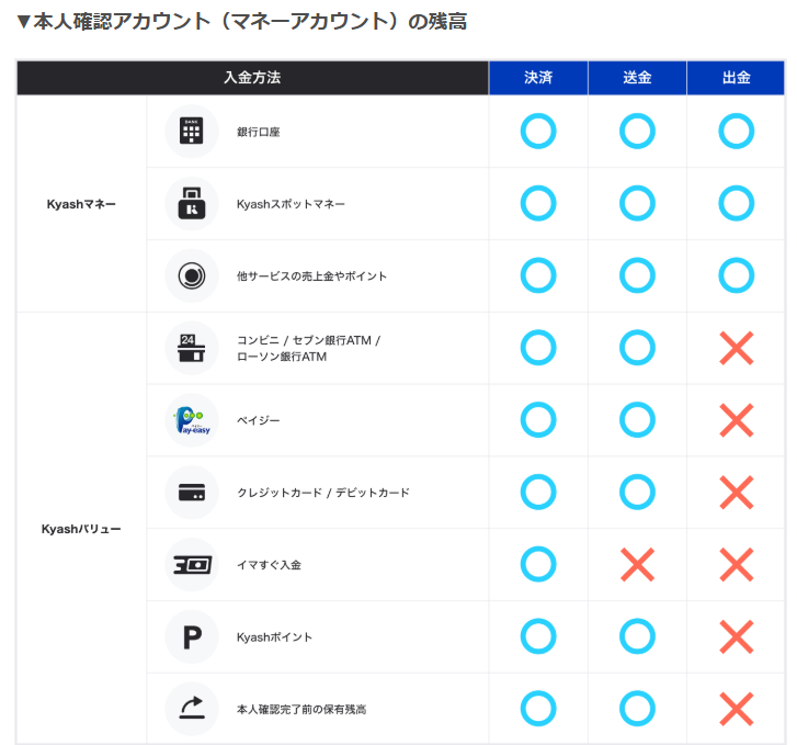 一方、上記以外のチャージ方法(クレジットカード、デビットカード、Kyashポイント、コンビニ、コンビニATMなど)では出金ができません。