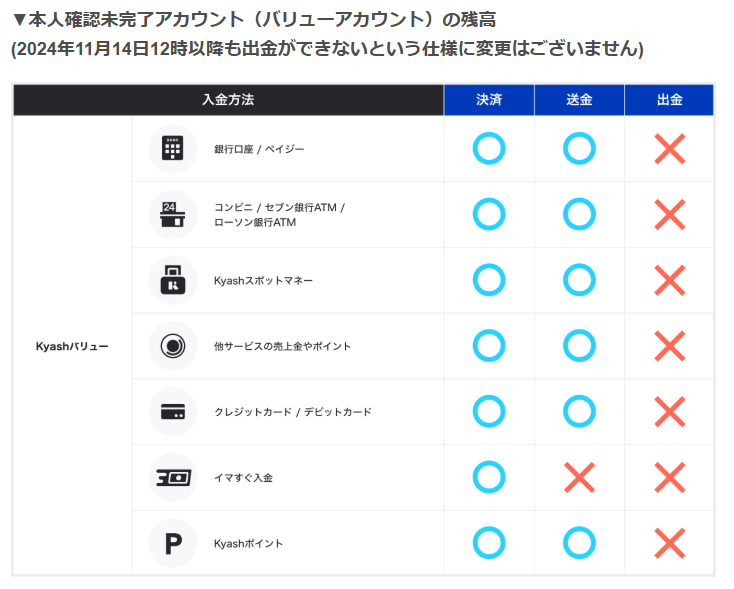 また、本人確認未完了アカウント(バリューアカウント)の方は入金方法を問わずKyashバリューになるため、出金はできません。
